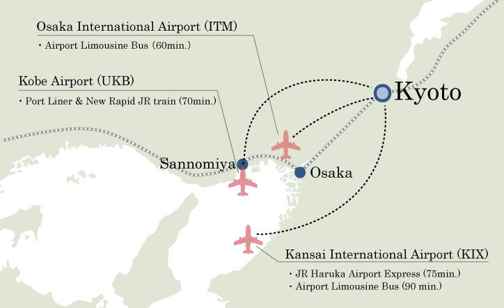 KIX − ( JR Haruka Airport Express ) → Kyoto Station - Airport Limousine Bus (1 hour 30 min.)