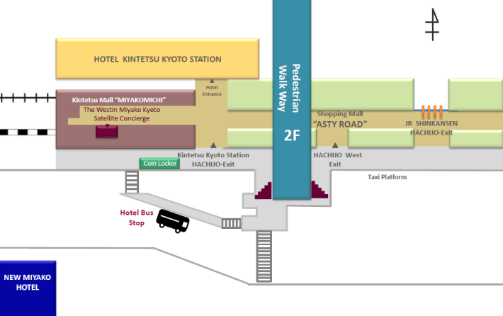 Kyoto Station HACHIJO Exit − ( 3 min Walk ) → Shuttle Bus Stop for Westin Miyako Hotel Kyoto − ( Shuttle Bus ) → Westin Miyako Hotel Kyoto